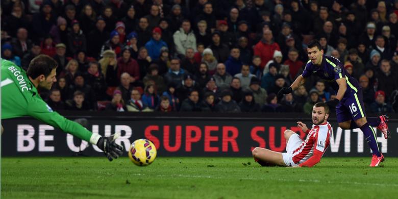 Justru gawang Stoke yang jebol pada menit ke-33 lewat aksi Sergio Aguero. Striker internasional Argentina ini melakukan aksi individu melalui sebuah skema serangan balik. Dari sisi kiri pertahanan lawan, dia melepaskan tendangan yang tak mampu dihalau Asmir Begovic.